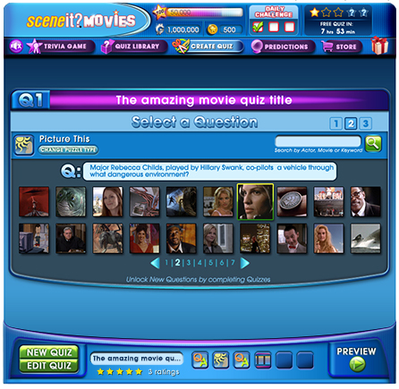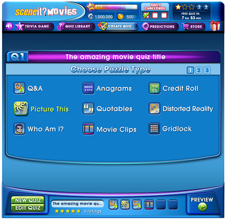 Here the player sees the question as it will appear in their final quiz. The player chooses six questions. The widget bottom center shows the type of quiz in each slot and which slots are empty.