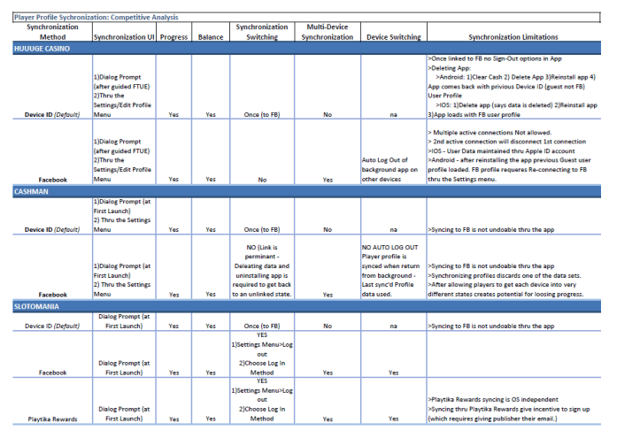 The Product Manager for this feature needed to understand the experience that our direct competitors offered to their players with regards to playing on multiple devices. The following is a simplified spreadsheet of my discoveries. It outlines the core findings relevant to how users expectations and goals are currently being addressed.