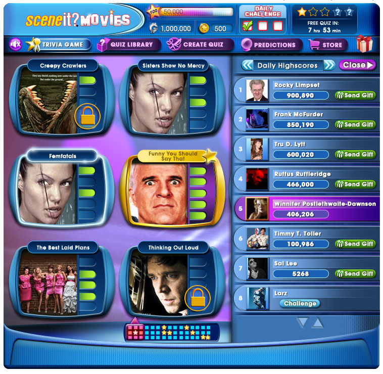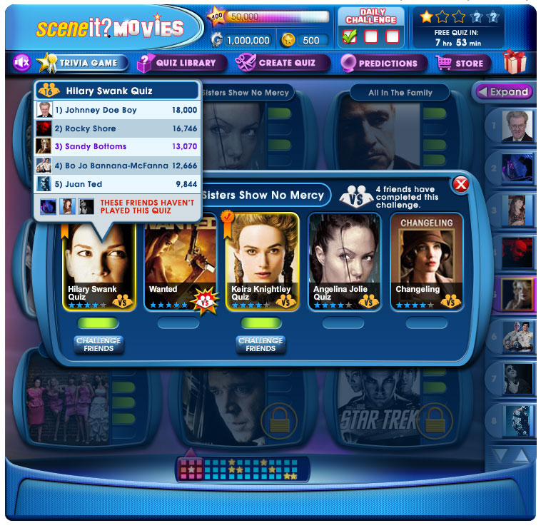 Create a new SceneIt?Movies experience that is designed to take advantage of a full suite of Casual Online Gaming features. The original Facebook game used an inflexible architecture that didn’t easily allow for features that engage players to play longer, play more often and most importantly, allow players to easily hook up with their friends to challenge them on their movie trivia prowess.