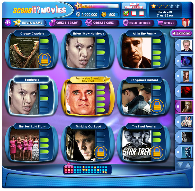 This project involved a ground up redesign of the original SceneIt? Facebook game. The original game was relatively flat in its structure with no added depth given to players as they return to play. A key feature to the redesign was to reward players for their progress by unlocking new content as they completed the available content.